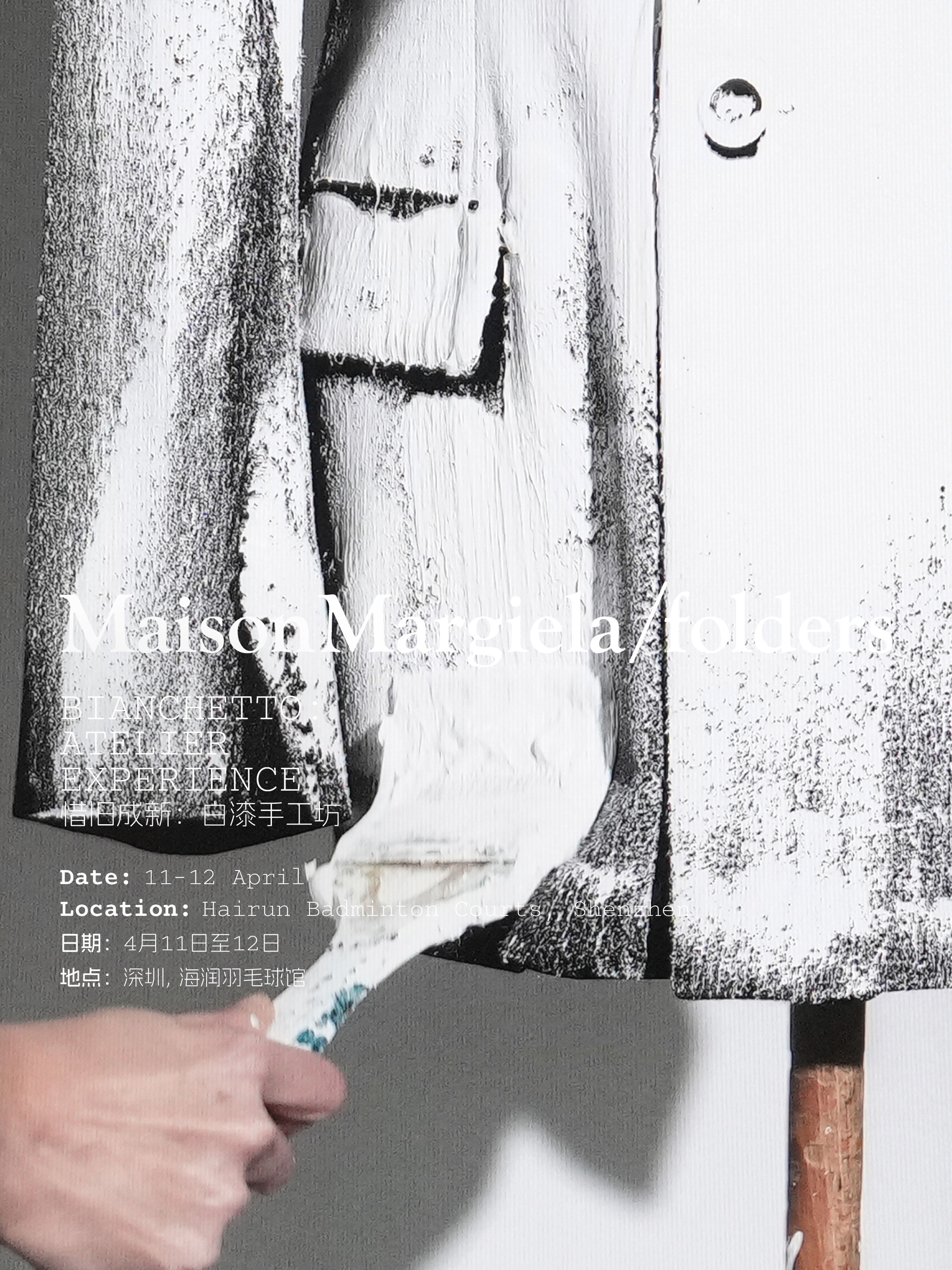 A Shenzhen, Bianchetto, la nostra tecnica di sovraverniciatura bianca che lascia visibili le pennellate e trasforma la superficie in una tela bianca, viene presentata attraverso un’esperienza immersiva di atelier. I partecipanti sono invitati a trasformare un capo del proprio guardaroba, guidati dal team Atelier della Maison Margiela. Attraverso l’atto di coprire la superficie con vernice bianca, il pezzo viene trasformato in un codice della Maison.