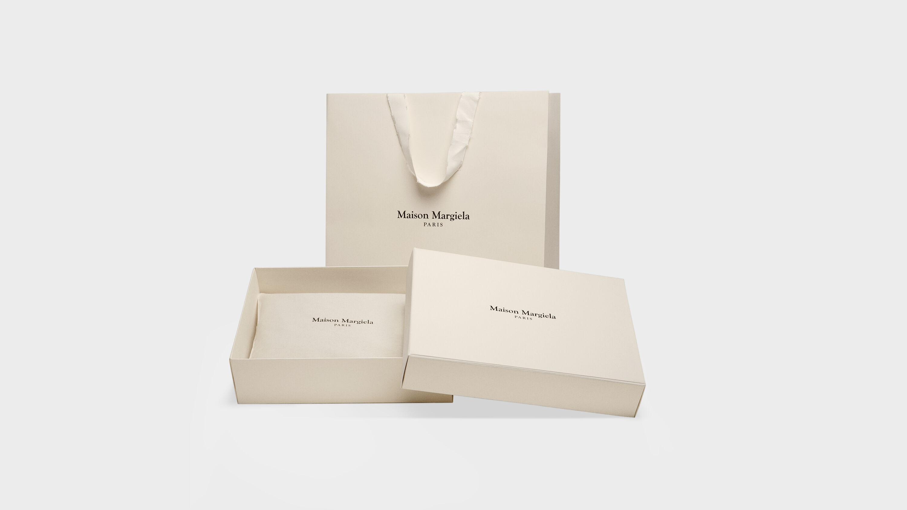 Il concetto di packaging di Maison Margiela si basa sulle filosofie centrali del marchio. Shopper, box, borse porta-abiti e custodie, sono tutte realizzate nel colore autentico del tessuto usato come prototipo, richiamano il cuore pulsante dell’haute couture. I manici bianco optical delle shopper sono sfilacciati per evocare il passare del tempo, come un'evoluzione delle originali e anonime tote bag della maison.