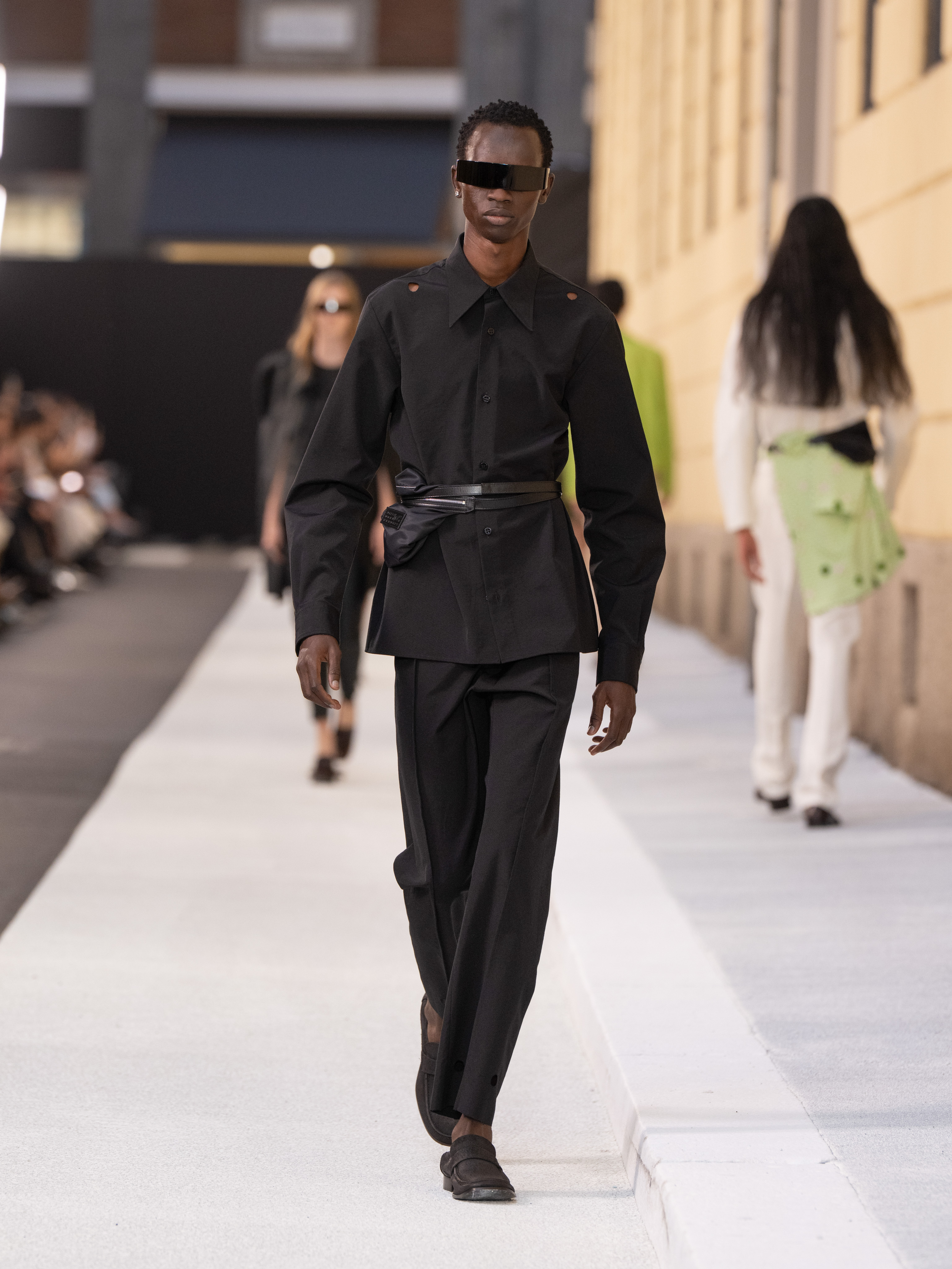 Passers-by follow one after the other in streamlined silhouettes across a palette of post-it brights, neutrals, and prints. A play of real versus illusion persists, while familiar archetypes are reimagined: garment bags become outerwear, shoulders are pushed forward, and a mix of categories exchange construction.